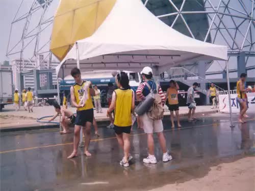 특수고압 살수차의 특수분사 노즐을 사용하여 폭6~10m 길이 최대 100m 의 야외 스텐드를 적셔줍니다.