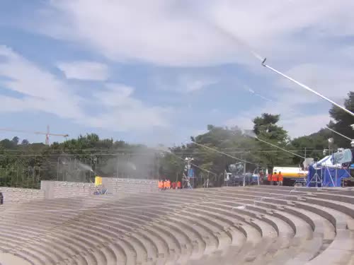 특수고압 살수차의 특수분사 노즐을 사용하여 폭6~10m 길이 최대 100m 의 야외 스텐드를 적셔줍니다.