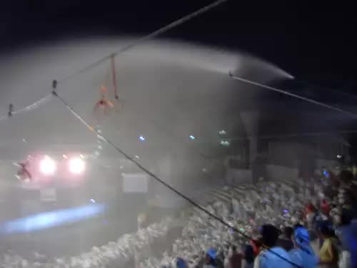 특수고압 살수차의 특수분사 노즐을 사용하여 폭6~10m 길이 최대 100m 의 야외 스텐드를 적셔줍니다.
